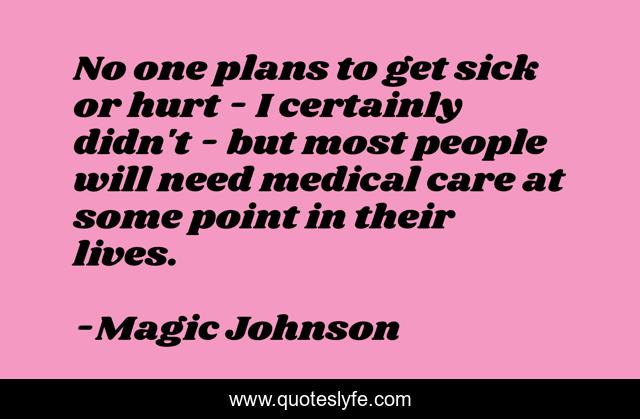 This page presents the quote "No one plans to get sick or hurt - I certainly didn't - but most people will need medical care at some point in their lives.". Author of this quote is Magic Johnson. This quote is about hurt, care, people,.