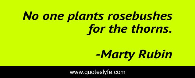 This page presents the quote "No one plants rosebushes for the thorns.". Author of this quote is Marty Rubin. This quote is about art, gardening, beauty, pleasure,.