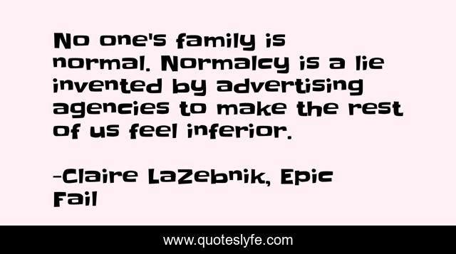 This page presents the quote "No one's family is normal. Normalcy is a lie invented by advertising agencies to make the rest of us feel inferior.". Author of this quote is Claire LaZebnik, Epic Fail. This quote is about normalcy, family,.