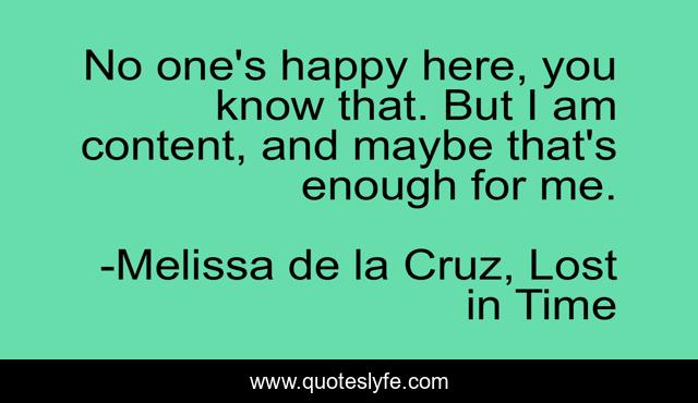 This page presents the quote "No one's happy here, you know that. But I am content, and maybe that's enough for me.". Author of this quote is Melissa de la Cruz, Lost in Time. This quote is about melissa-de-la-cruz, lost-in-time, behaviour, attitude, contentment, hell, happiness,.