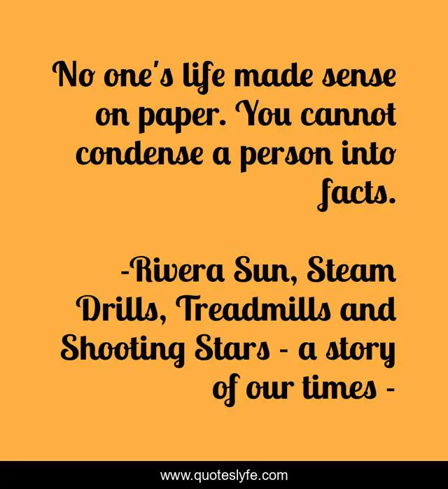 This page presents the quote "No one's life made sense on paper. You cannot condense a person into facts.". Author of this quote is Rivera Sun, Steam Drills, Treadmills and Shooting Stars - a story of our times -. This quote is about facts-of-life, life, people, soul, wisdom, person, human, facts, spirit,.