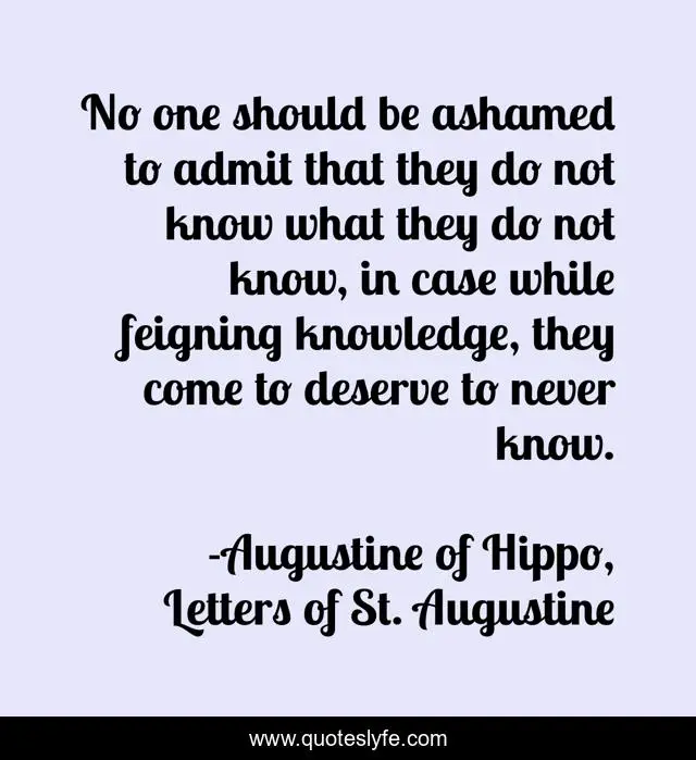 This page presents the quote "No one should be ashamed to admit that they do not know what they do not know, in case while feigning knowledge, they come to deserve to never know.". Author of this quote is Augustine of Hippo, Letters of St. Augustine. This quote is about st-augustine, knowledge, wisdom,.