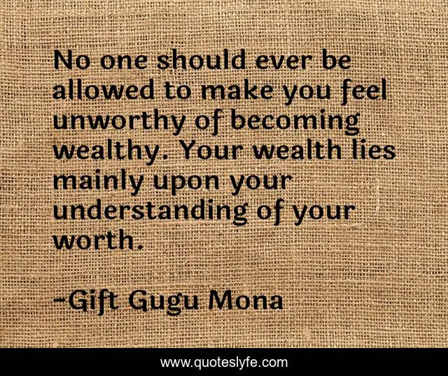 This page presents the quote "No one should ever be allowed to make you feel unworthy of becoming wealthy. Your wealth lies mainly upon your understanding of your worth.". Author of this quote is Gift Gugu Mona. This quote is about business-success, wealthy, unworthy, worth, wealth,.