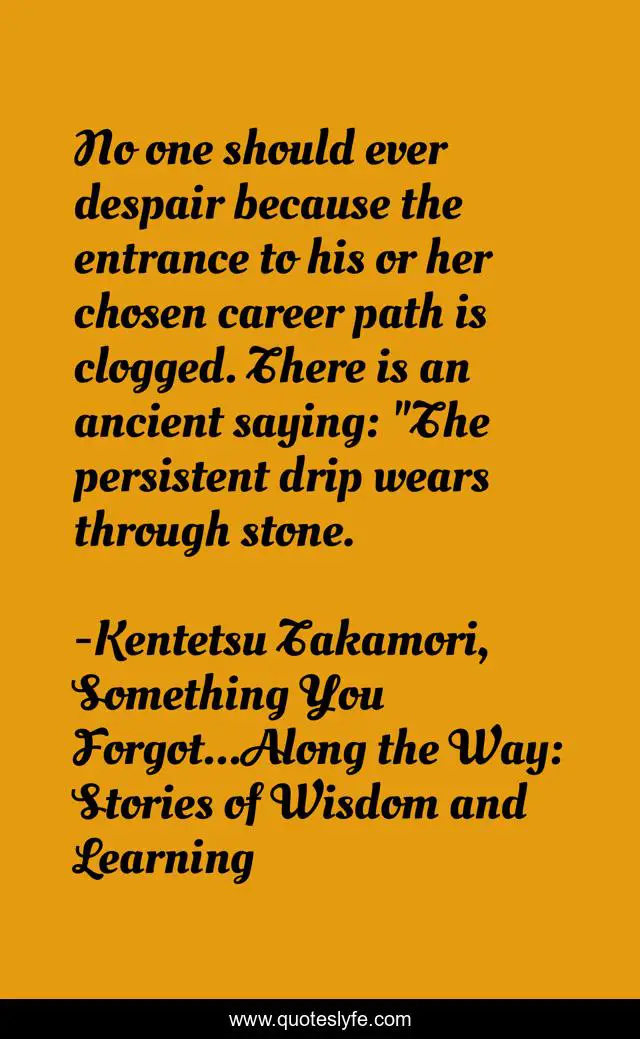 This page presents the quote "No one should ever despair because the entrance to his or her chosen career path is clogged. There is an ancient saying: "The persistent drip wears through stone.". Author of this quote is Kentetsu Takamori, Something You Forgot...Along the Way: Stories of Wisdom and Learning. This quote is about buddhism, inspiration, self-help,.