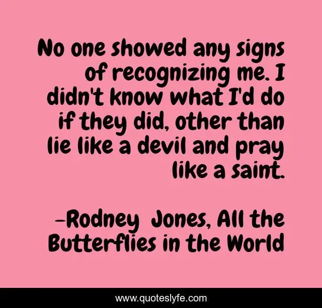 This page presents the quote "No one showed any signs of recognizing me. I didn't know what I'd do if they did, other than lie like a devil and pray like a saint.". Author of this quote is Rodney Jones, All the Butterflies in the World. This quote is about pray, lie, devil, saint, recognize,.
