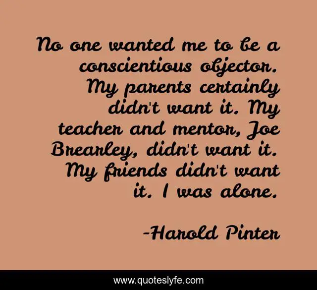This page presents the quote "No one wanted me to be a conscientious objector. My parents certainly didn't want it. My teacher and mentor, Joe Brearley, didn't want it. My friends didn't want it. I was alone.". Author of this quote is Harold Pinter. This quote is about alone, friends, parents,.