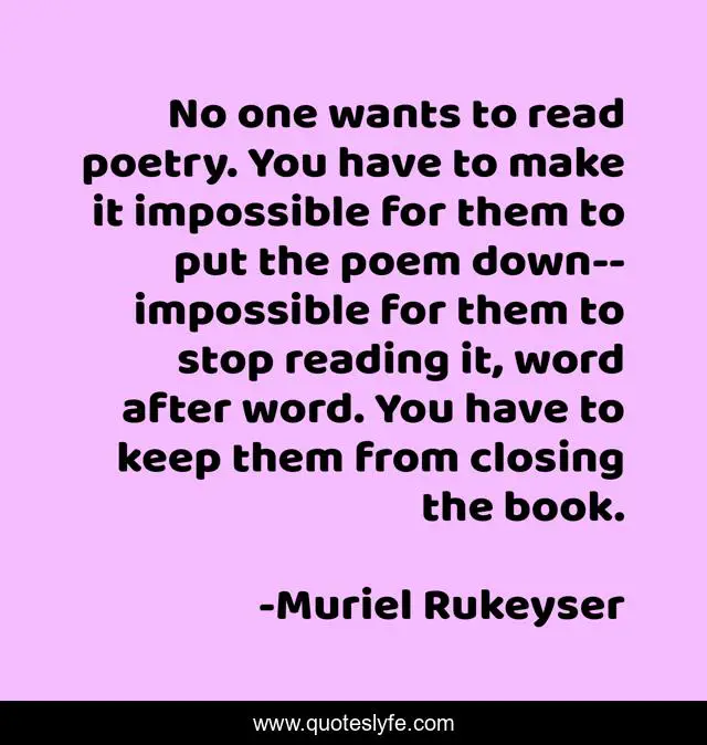 This page presents the quote "No one wants to read poetry. You have to make it impossible for them to put the poem down--impossible for them to stop reading it, word after word. You have to keep them from closing the book.". Author of this quote is Muriel Rukeyser. This quote is about poetcast, poetry, writing, muriel-rukeyser, sharon-olds, poets-org,.