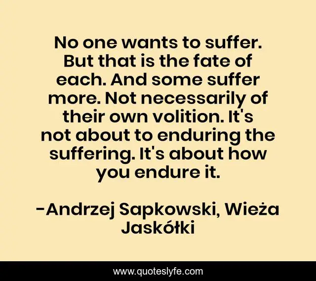 This page presents the quote "No one wants to suffer. But that is the fate of each. And some suffer more. Not necessarily of their own volition. It's not about to enduring the suffering. It's about how you endure it.". Author of this quote is Andrzej Sapkowski, Wieża Jaskółki. This quote is about fate, suffering, endure, enduring, suffer, volition,.