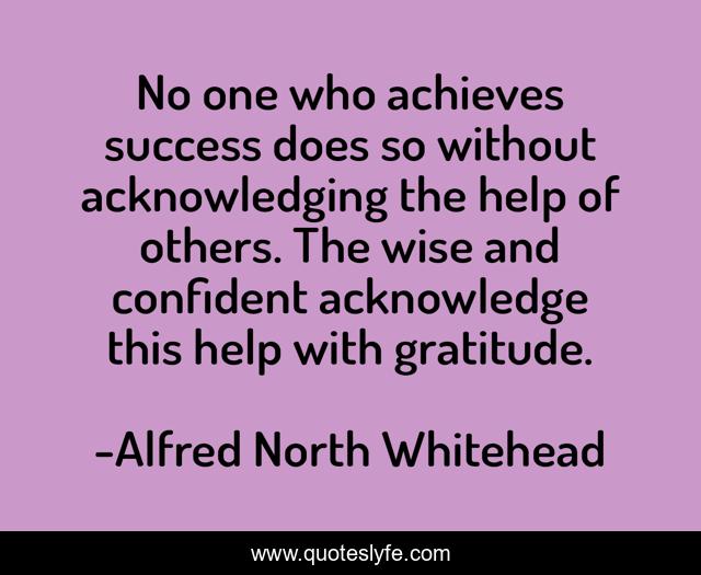 This page presents the quote "No one who achieves success does so without acknowledging the help of others. The wise and confident acknowledge this help with gratitude.". Author of this quote is Alfred North Whitehead. This quote is about gratitude, wise, success,.
