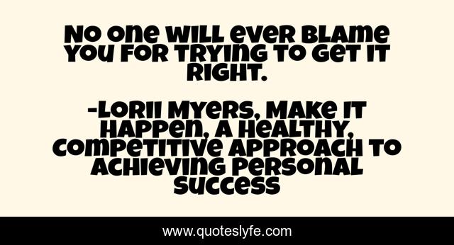 This page presents the quote "No one will ever blame you for trying to get it right.". Author of this quote is Lorii Myers, Make It Happen, A Healthy, Competitive Approach to Achieving Personal Success. This quote is about blame, excuses, make-it-happen,.