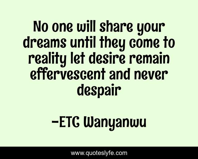 This page presents the quote "No one will share your dreams until they come to reality let desire remain effervescent and never despair". Author of this quote is ETC Wanyanwu. This quote is about enthusiasm, life, dreams, inspirational, success,.