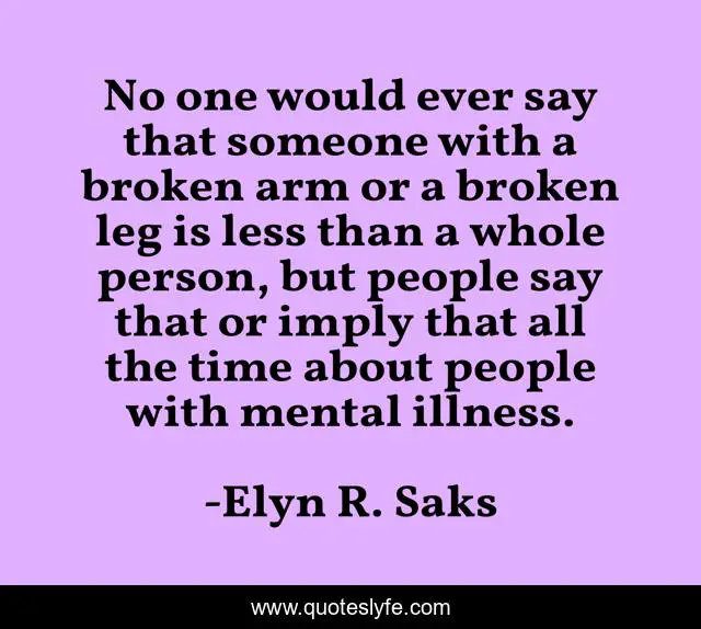 This page presents the quote "No one would ever say that someone with a broken arm or a broken leg is less than a whole person, but people say that or imply that all the time about people with mental illness.". Author of this quote is Elyn R. Saks. This quote is about stereotype, mental-health-stigma, humanity, bias, prejudice, diagnosis, mental-disorder, stigma, psychiatric-abuse,.