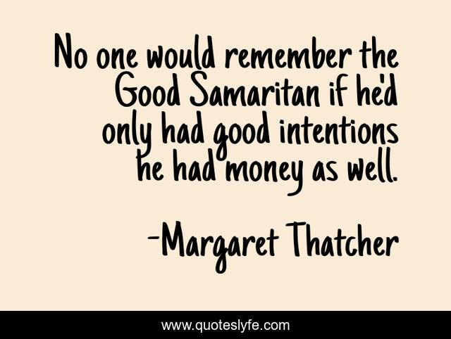 This page presents the quote "No one would remember the Good Samaritan if he'd only had good intentions he had money as well.". Author of this quote is Margaret Thatcher. This quote is about good, remember,.