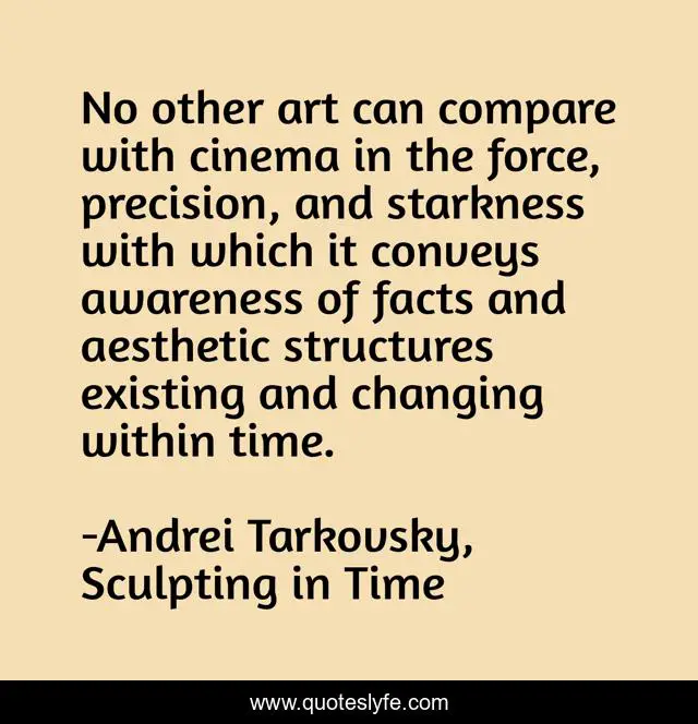 This page presents the quote "No other art can compare with cinema in the force, precision, and starkness with which it conveys awareness of facts and aesthetic structures existing and changing within time.". Author of this quote is Andrei Tarkovsky, Sculpting in Time. This quote is about cinema, tarkovsky, art, film, time,.