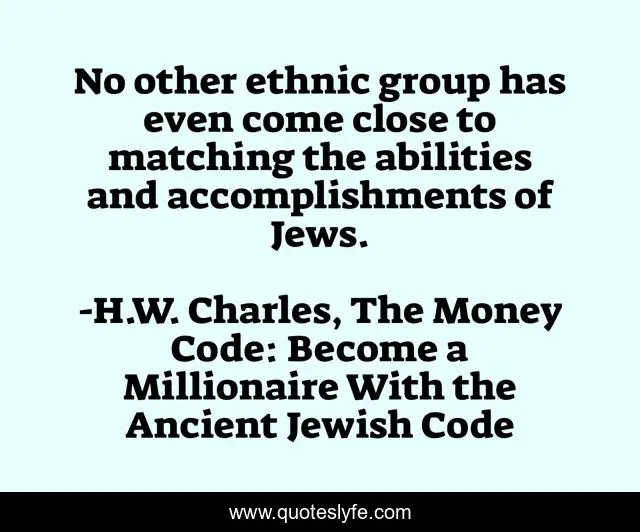 This page presents the quote "No other ethnic group has even come close to matching the abilities and accomplishments of Jews.". Author of this quote is H.W. Charles, The Money Code: Become a Millionaire With the Ancient Jewish Code. This quote is about money-management, money, success, jewish-wealth, wealth-creation,.