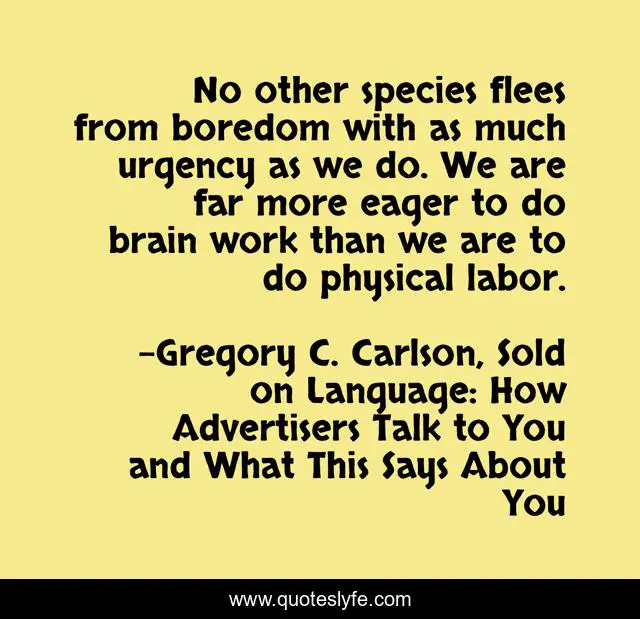 This page presents the quote "No other species flees from boredom with as much urgency as we do. We are far more eager to do brain work than we are to do physical labor.". Author of this quote is Gregory C. Carlson, Sold on Language: How Advertisers Talk to You and What This Says About You. This quote is about novelty, curiosity, learning,.