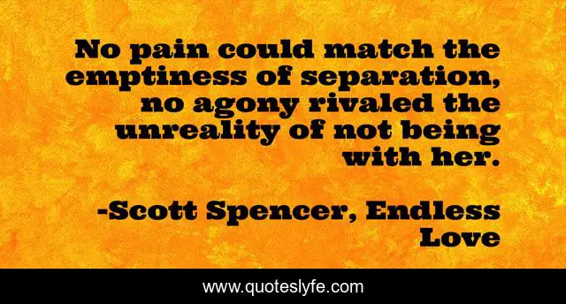 This page presents the quote "No pain could match the emptiness of separation, no agony rivaled the unreality of not being with her.". Author of this quote is Scott Spencer, Endless Love. .