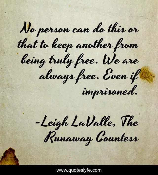 This page presents the quote "No person can do this or that to keep another from being truly free. We are always free. Even if imprisoned.". Author of this quote is Leigh LaValle, The Runaway Countess. This quote is about freedom, choices, life-and-living, inspirational, enthusiasm,.