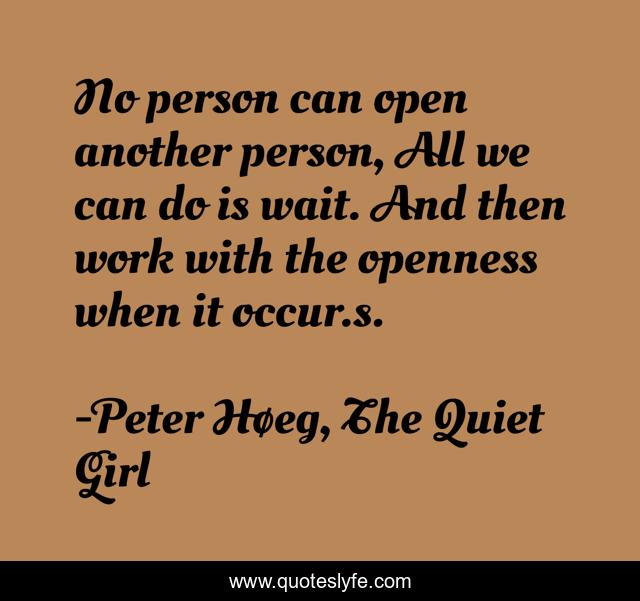 This page presents the quote "No person can open another person, All we can do is wait. And then work with the openness when it occur.s.". Author of this quote is Peter Høeg, The Quiet Girl. This quote is about open-mindedness, openness-work, personal-development, open, wait,.