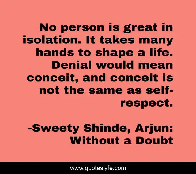 This page presents the quote "No person is great in isolation. It takes many hands to shape a life. Denial would mean conceit, and conceit is not the same as self-respect.". Author of this quote is Sweety Shinde, Arjun: Without a Doubt. This quote is about humility, inspiration,.