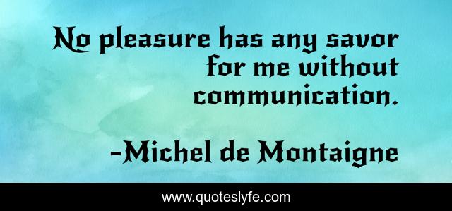 This page presents the quote "No pleasure has any savor for me without communication.". Author of this quote is Michel de Montaigne. This quote is about me, pleasure, without,.