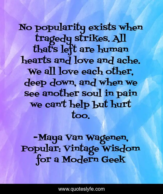 This page presents the quote "No popularity exists when tragedy strikes. All that's left are human hearts and love and ache. We all love each other, deep down, and when we see another soul in pain we can't help but hurt too.". Author of this quote is Maya Van Wagenen, Popular: Vintage Wisdom for a Modern Geek. This quote is about loss, death, love, popularity, popular, tragedy, affection,.
