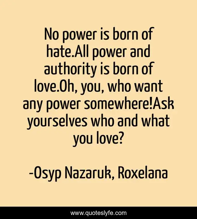 This page presents the quote "No power is born of hate.All power and authority is born of love.Oh, you, who want any power somewhere!Ask yourselves who and what you love?". Author of this quote is Osyp Nazaruk, Roxelana. This quote is about hate, love, power, affection,.