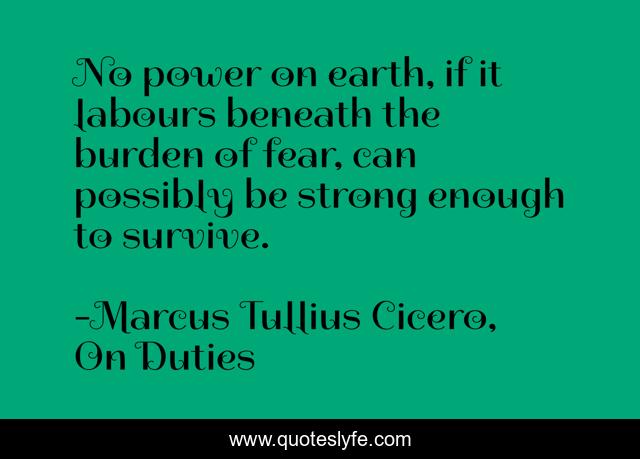 This page presents the quote "No power on earth, if it labours beneath the burden of fear, can possibly be strong enough to survive.". Author of this quote is Marcus Tullius Cicero, On Duties. This quote is about fear, anxiety, roman, philosophy,.