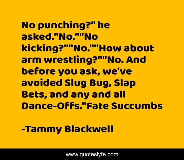 This page presents the quote "No punching?" he asked."No.""No kicking?""No.""How about arm wrestling?""No. And before you ask, we've avoided Slug Bug, Slap Bets, and any and all Dance-Offs."Fate Succumbs". Author of this quote is Tammy Blackwell. This quote is about funny, comedy,.