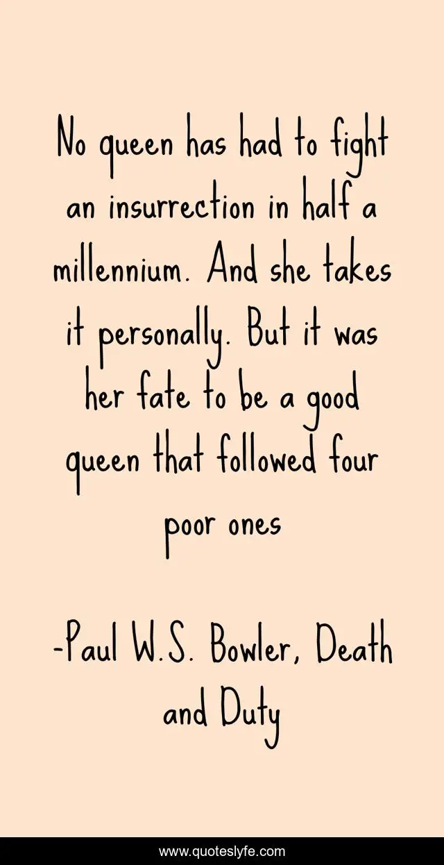 This page presents the quote "No queen has had to fight an insurrection in half a millennium. And she takes it personally. But it was her fate to be a good queen that followed four poor ones". Author of this quote is Paul W.S. Bowler, Death and Duty. .