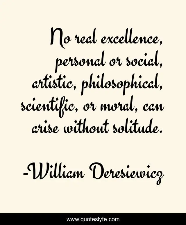 This page presents the quote "No real excellence, personal or social, artistic, philosophical, scientific, or moral, can arise without solitude.". Author of this quote is William Deresiewicz. This quote is about scientific, solitude, philosophical, moral, artistic, social, excellence,.