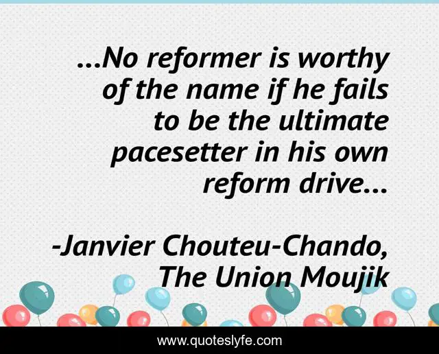 This page presents the quote "...No reformer is worthy of the name if he fails to be the ultimate pacesetter in his own reform drive...". Author of this quote is Janvier Chouteu-Chando, The Union Moujik. This quote is about joy, life, love, happiness, affection,.