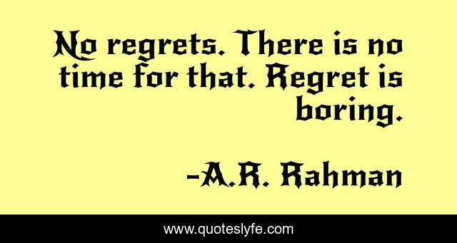 This page presents the quote "No regrets. There is no time for that. Regret is boring.". Author of this quote is A.R. Rahman. This quote is about enthusiasm, inpirational-attitude, regrets, inspirational,.