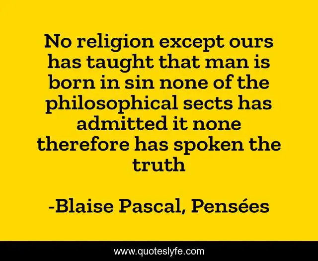 This page presents the quote "No religion except ours has taught that man is born in sin none of the philosophical sects has admitted it none therefore has spoken the truth". Author of this quote is Blaise Pascal, Pensées. This quote is about religion, dogmatism,.