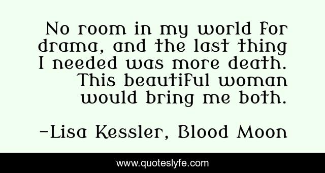This page presents the quote "No room in my world for drama, and the last thing I needed was more death. This beautiful woman would bring me both.". Author of this quote is Lisa Kessler, Blood Moon. This quote is about paranormal-romance, werewolf-romance,.