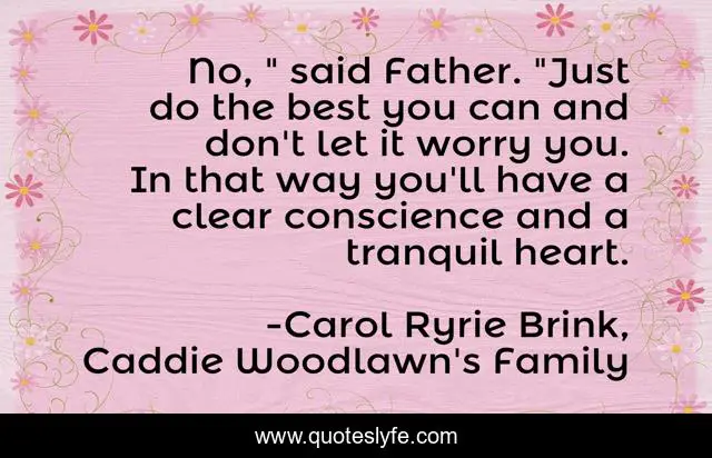 This page presents the quote "No, " said Father. "Just do the best you can and don't let it worry you. In that way you'll have a clear conscience and a tranquil heart.". Author of this quote is Carol Ryrie Brink, Caddie Woodlawn's Family. This quote is about conscience, effort,.