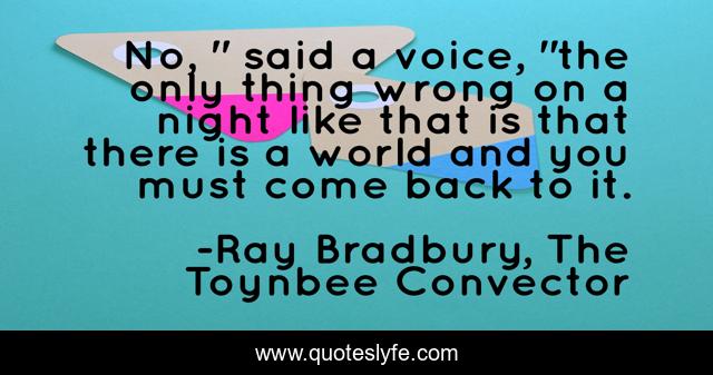 This page presents the quote "No, " said a voice, "the only thing wrong on a night like that is that there is a world and you must come back to it.". Author of this quote is Ray Bradbury, The Toynbee Convector. This quote is about enthusiasm, nights-outdoors, bradbury, inspirational, nature,.