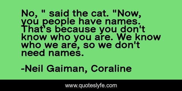 This page presents the quote "No, " said the cat. "Now, you people have names. That's because you don't know who you are. We know who we are, so we don't need names.". Author of this quote is Neil Gaiman, Coraline. This quote is about funny-but-true, confidence, cats, names,.