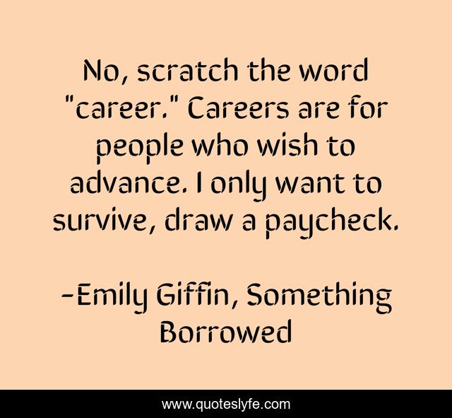 This page presents the quote "No, scratch the word "career." Careers are for people who wish to advance. I only want to survive, draw a paycheck.". Author of this quote is Emily Giffin, Something Borrowed. This quote is about career, giffin, emily,.
