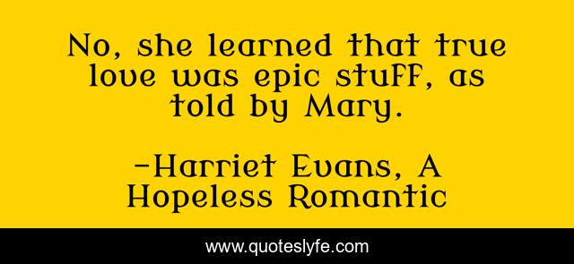 This page presents the quote "No, she learned that true love was epic stuff, as told by Mary.". Author of this quote is Harriet Evans, A Hopeless Romantic. This quote is about love, true, affection,.