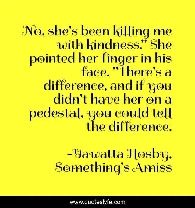This page presents the quote "No, she's been killing me with kindness." She pointed her finger in his face. "There's a difference, and if you didn't have her on a pedestal, you could tell the difference.". Author of this quote is Yawatta Hosby, Something's Amiss. This quote is about drama, romance, women-s-fiction,.