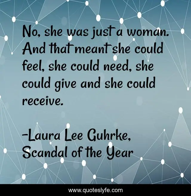 This page presents the quote "No, she was just a woman. And that meant she could feel, she could need, she could give and she could receive.". Author of this quote is Laura Lee Guhrke, Scandal of the Year. This quote is about woman-s-strength, woman,.