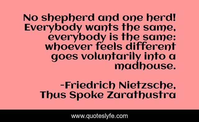 This page presents the quote "No shepherd and one herd! Everybody wants the same, everybody is the same: whoever feels different goes voluntarily into a madhouse.". Author of this quote is Friedrich Nietzsche, Thus Spoke Zarathustra. This quote is about existentialism, conformity,.