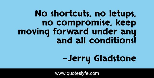 This page presents the quote "No shortcuts, no letups, no compromise, keep moving forward under any and all conditions!". Author of this quote is Jerry Gladstone. This quote is about empowering, confidence, positive, motivational, optimistic, inspirational, enthusiasm,.
