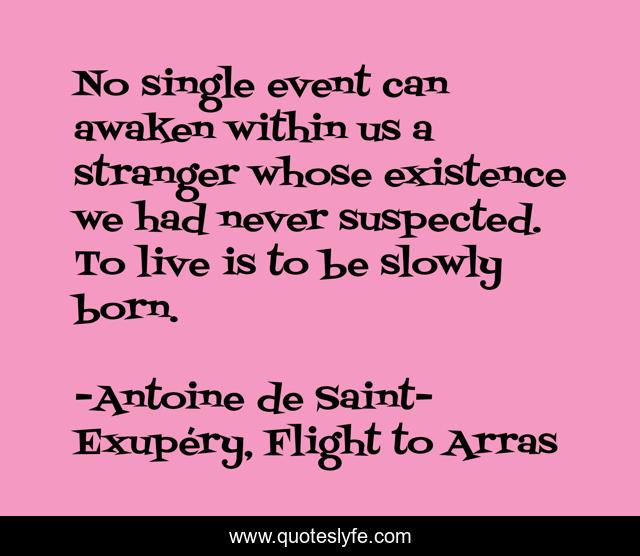 This page presents the quote "No single event can awaken within us a stranger whose existence we had never suspected. To live is to be slowly born.". Author of this quote is Antoine de Saint-Exupéry, Flight to Arras. This quote is about life, philosophy,.