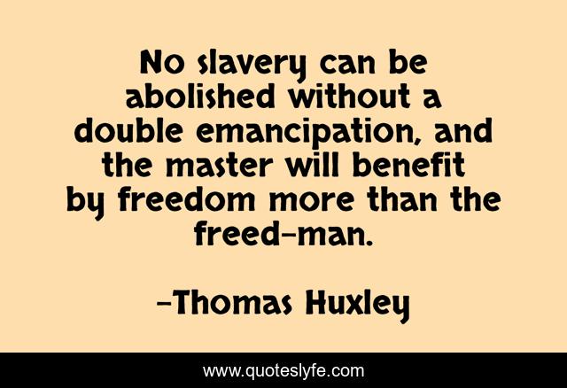 This page presents the quote "No slavery can be abolished without a double emancipation, and the master will benefit by freedom more than the freed-man.". Author of this quote is Thomas Huxley. This quote is about double, master, slavery,.