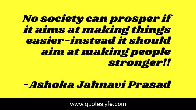 This page presents the quote "No society can prosper if it aims at making things easier-instead it should aim at making people stronger!!". Author of this quote is Ashoka Jahnavi Prasad. This quote is about enthusiasm, philosophy, inspirational,.