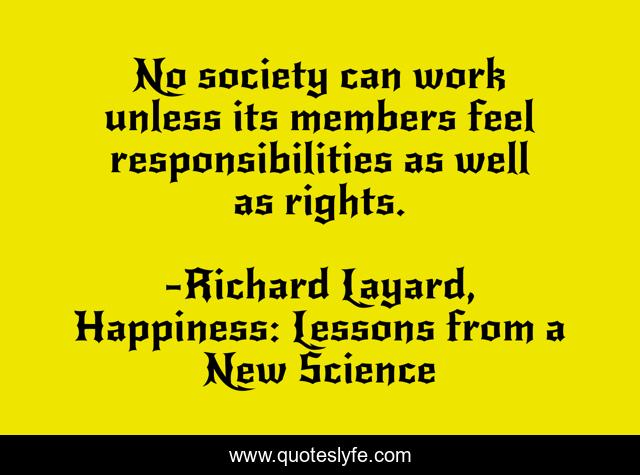 This page presents the quote "No society can work unless its members feel responsibilities as well as rights.". Author of this quote is Richard Layard, Happiness: Lessons from a New Science. .