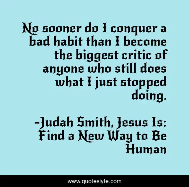 This page presents the quote "No sooner do I conquer a bad habit than I become the biggest critic of anyone who still does what I just stopped doing.". Author of this quote is Judah Smith, Jesus Is: Find a New Way to Be Human. This quote is about spirituality, judging-others, jesus,.