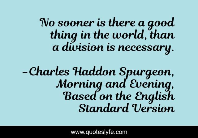 This page presents the quote "No sooner is there a good thing in the world, than a division is necessary.". Author of this quote is Charles Haddon Spurgeon, Morning and Evening, Based on the English Standard Version. This quote is about discipleship, identity,.